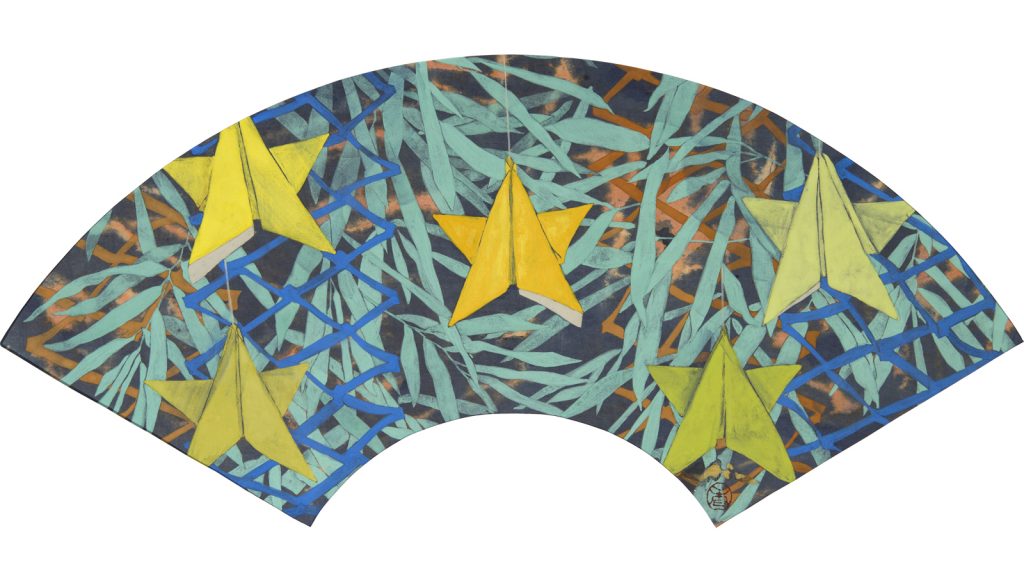 Among the many notable works specially composed for this exhibition is a pair of two panel screens entitled Yoruhiru sakura-zu – meaning cherry blossoms by day and by night – inspired by the renowned work Kohaku bai-zu Byobu by Korin Ogata (1658 – 1716) of the Rinpa school of painting, Someya’s unique interpretation of a furosaki byobu tea-room screen in a work that combines cedar wood and paper substrate, and a portrayal of the four seasons of Japan composed on folding paper fans.